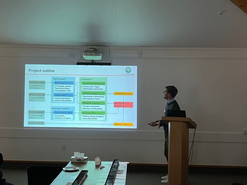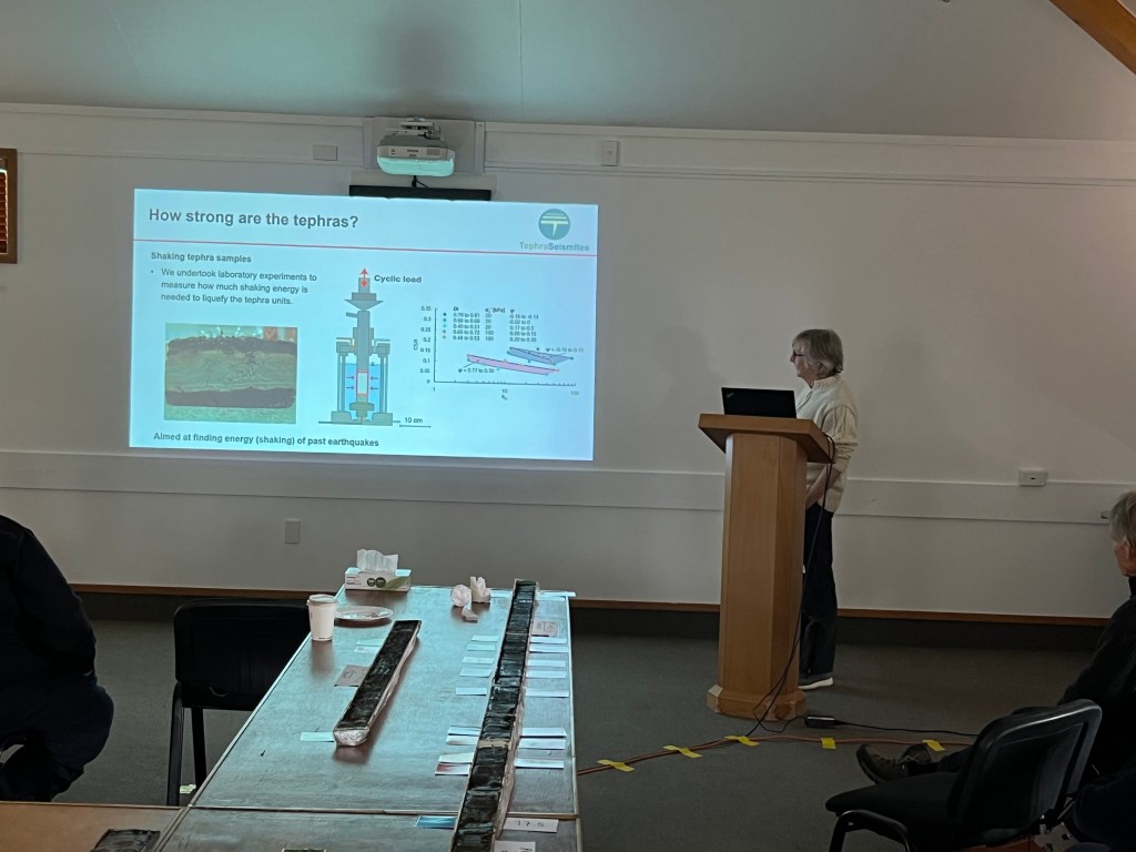 Five shorter talks that followed focused on different areas of the project: ‘Cores on a fine scale: using CT scans to understand lake sediments’ (Dr Tehnuka Ilanko); ‘Messing about in boats: investigating distribution of liquefaction features in lake sediments using ground-penetrating radar’ (Richard Melchert); ‘Our precious lakes’ (Prof. David Lowe); ‘Not our fault: Te Puninga Fault near Morrinsville’ (Josh Hughes); ‘Using laboratory liquefaction testing to estimate past earthquake shaking’ (Jordanka Chaneva). We wrapped up with a summary and an idea of next steps towards modelling past earthquake shaking from Dr Vicki Moon.